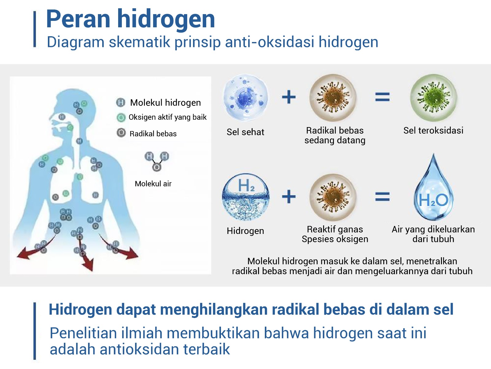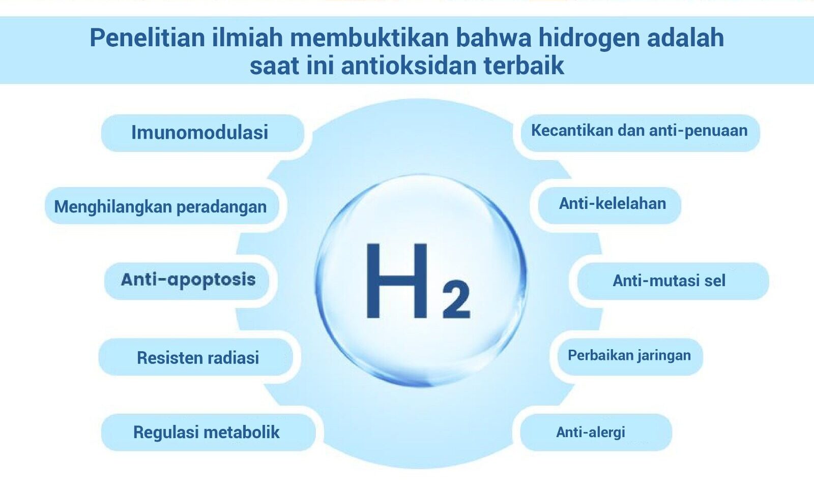 Molekular hidrogen ini memiliki zat aktif untuk meningkatkan kadar Antioksidan yang baik untuk tubuh, saat dikonsumsi air yang mengandung molekular hidrogen mampu mereduksi stress dan tekanan dalam tubuh